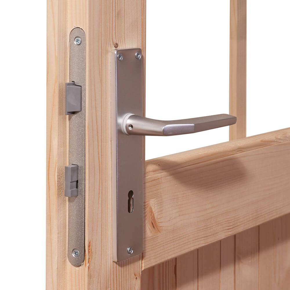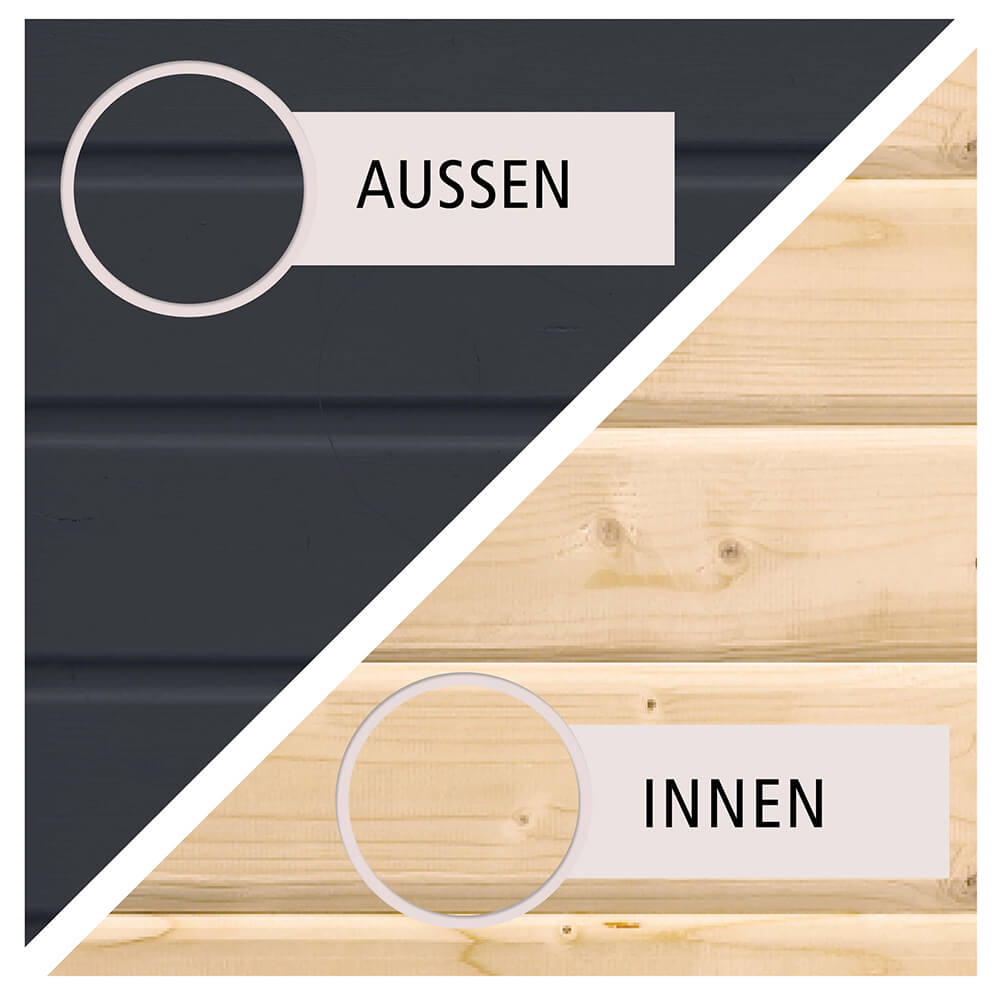 28 mm Wandstärke, Doppeltür, Blockbohlen-Bauweise, Firsthöhe 222 cm, Nadelholz farbig behandelt.
