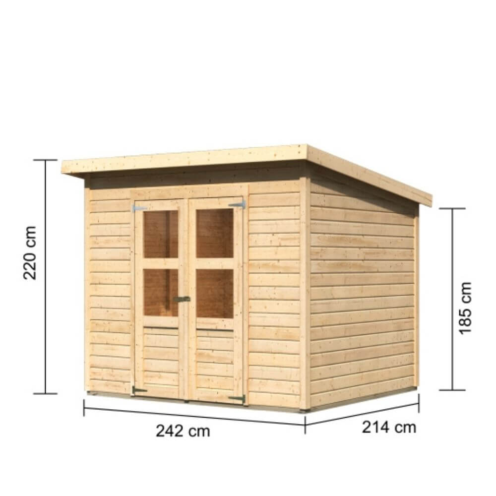 Das Gartenhaus mit optionalem Anbau. Ein Gartenhaus zum Verstauen der Gartengeräte und ein schützendes Dach für das Spielzeug Ihrer Kleinen oder als Unterstand für Fahrräder. Diese und noch viele weitere Möglichkeiten bietet das Gartenhaus Merseburg 5. Durch sein naturbelassenes Holz kann es durch einen farblich individuellen Anstrich auf Ihr Gartenambiente abgestimmt werden. Das Gartenhaus Merseburg setzt Ihnen hier keine Grenzen. Der Innenraum mit den Maßen (BxT) 235x207cm, bietet ausreichend Platz für Ihre Gegenstände. Das Haus wird von unten mit kesseldruckimprägnierten Bodenbalken geschützt. Von oben bietet das Pultdach Schutz vor der Witterung. Die Doppelflügeltür mit zwei Lichtausschnitten je Türflügel und einer Sicherheitsüberfalle lässt viel Tageslicht in das Innere und bietet so eine natürliche Lichtquelle. Reicht Ihnen der Platz im Inneren nicht aus können Sie das Gartenhaus Merseburg 5mit einem optional erhältlichen Anbaudach erweitern. Das Anbaudach hat eine Breite von 166cm und eignet sich ideal als Unterstellmöglichkeit für größere Gegenstände. Mit einer optional erhältlichen Rückwand bieten Sie Ihren Gegenständen noch mehr Schutz vor der Witterung. Das Gartenhaus Merseburg 5 - ein Gartenhaus mit optionalem Anbau.