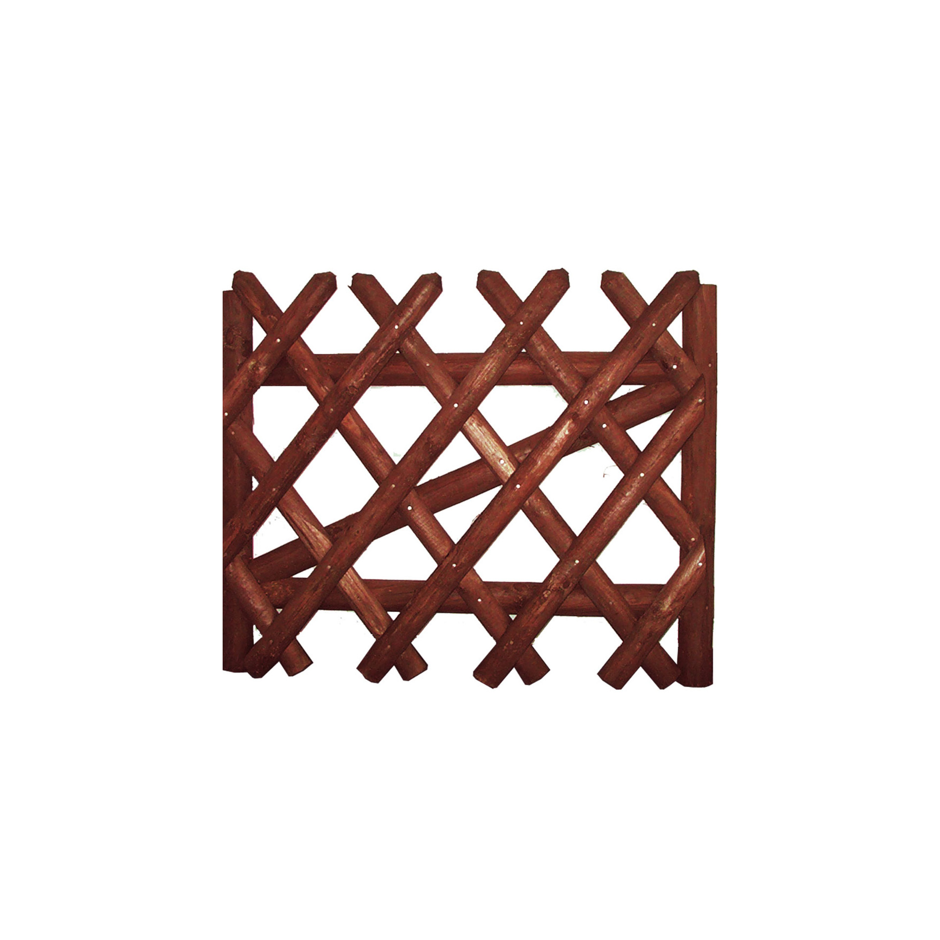 Klassisches Jägerzaunfeld aus Kesseldruckimprägniertem Nadelholz, braun gefärbt. Durch eine Kesseldruckimprägnierung werden Hölzer, die eine relativ geringe natürliche Dauerhaftigkeit haben, resistenter gegen den Befall von Insekten, Pilzen und Fäulnissen.