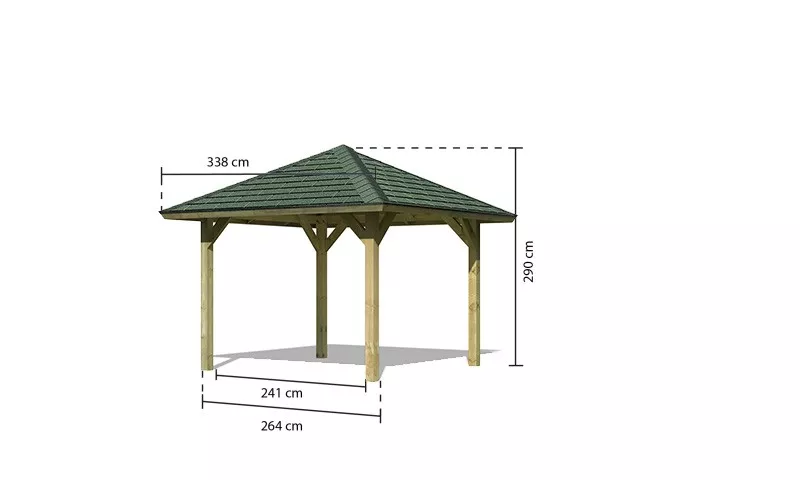Pavillon Bergen 1 bietet, mit einem Außenmaß von (BxT) 264,5x264,5cm, ausreichend Möglichkeiten. Nutzen Sie die gewonnene Fläche in Ihrem Garten für eine gemütliche Sitzgruppe zum Entspannen. Richten Sie sich mit einem Tresen und ein paar Hockern eine gemütliche Bar ein. Oder nutzen Sie den Pavillon Bergen 1 als Unterstellmöglichkeit für Ihren großen Gartentisch zum Essen und Beisammensein. Das Dach mit einer Dachfläche von 12,8m² wird von vier 11,5x11,5 cm starken, kesseldruckimprägnierten Massivholzpfosten inkl. Querverbindern gestützt. Einen angenehmen Stand ermöglicht eine Höhe von 290 cm. Erweitern Sie Ihren Pavillon Bergen 1 und machen Sie Ihn zu einem echten Highlight in Ihrem Garten mit einer Brüstung und dem passenden Fußboden. Abrunden können Sie das Gesamtbild mit unseren optional erhältlichen Dachschindeln. Geschützt wird das Holz des Pavillons durch ein kesseldruckimprägnierende Verfahren. Hierbei werden mithilfe von Druck chemische Salze in das Holz gepresst und es wird somit vor der Witterung geschützt. So wird der Pavillon zu einem treuen Begleiter in Ihrem Garten und wird mit Ihnen bestimmt viele Geburtstage, Grillabende und entspannte Sommertage erleben. Kreieren Sie Ihren eigenen zusätzlichen Platz im Garten mit dem Pavillon Bergen 1.