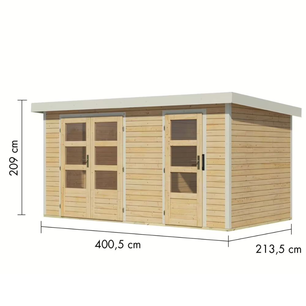 Attraktiv und praktisch: das Gartenhaus Merkur mit Mittelwand. Durch die Mittelwand können die zwei Räume individuell eingesetzt werden. So können Sie den kleinen Raum zum Beispiel als Abstellraum Ihrer Gartengeräte nutzen und den größeren Raum als kleine Bastelwerkstatt gestalten. Ihrer Fantasie werden hier keine Grenzen gesetzt. Der große Raum wird durch eine Doppelflügeltür und der kleine Raum durch eine Einflügeltür mit je 3 Lichtausschnitten pro Türflügel und einem Zylinderschloss verschlossen. So werden Ihre Gegenstände im Inneren vor unbefugtem Entwenden geschützt. Mit einem Außenmaß von 404 x 217 cm hat das Hybridhaus Merkur die ideale Größe für nahezu jeden Garten. Wenn Sie auf der Suche nach einem Gartenhaus mit zwei Räumen für noch mehr Ordnung sind, dann ist das Gartenhaus Merkur Ihr attraktives und praktisches Haus im eigenen Garten.