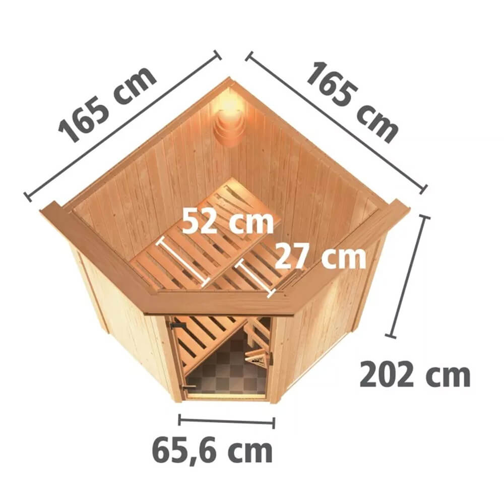 Das volle Saunaerlebnis genießen und dennoch Energie sparen. Dies ist möglich mit unserenr 68mm Systemsauna Nanja und dem steckerfertigen 3,6kW-Saunaofen. Durch die vormontierten Wandelemente kann die Sauna schnell und einfach montiert werden. Die 68mm starken Elemente bestehen aus einer Rahmenkonstruktion, welche an der Sichtseite mit 12,5mm starkem Spezial-Softline-Profilholz verstärkt sind. Diese Konstruktion bietet eine ideale Isolierung und hält die Wärme perfekt im Innenraum. Optional ist die Sauna Nanja mit einem Dachkranz inkl. drei LED-Spots erhältlich. Diese sorgen nicht nur für ein schönes Ambiente im Außenbereich der Sauna, sondern setzen diese auch noch gekonnt in Szene. Die Außenmaße betragen 151 x 151 x 198cm (B/T/H). In den großen Innenraum der Sauna gelangen Sie durch eine Saunatür. Hier haben Sie die Wahl aus vier Varianten und das ganz ohne Mehrkosten. Egal ob in der wärmegedämmten, energiesparenden Version, der klaren Ganzglastür, der Version mit bronzierte Ganzglastür oder der modernen graphitfarbenen Türversion. Hier ist garantiert für jeden Geschmack das Richtige dabei. Um sich im Saunainneren perfekt erholen zu können, wird hier1 Saunaliege aus massivem Espenholz montiert. Das Holz ist besonders weich und nimmt die Wärme nicht so stark an. Dies ermöglicht ein angenehmes Sitz- und Liegegefühl. Bei dem steckerfertigen Saunaofen können Sie zwischen drei Varianten wählen. Einer mit integrierter Steuerung, einer mit externem Steuergerät Easy und einem 3,6kW Bio-Kombi-Ofen. Das Besondere an diesem Saunaofen ist aber nicht seine Variantenvielfallt, sondern der Anschluss. Der Ofen wird mithilfe eines Steckers zur Inbetriebnahme an eine hausübliche 230Volt-Steckdose angeschlossen. Da hierfür kein Fachmann erforderlich ist, entfallen die Kosten für einen Elektriker und einen Umbau auf einen 400 Volt-Anschluss. Genießen Sie das volle Saunaerlebnis und sparen zusätzlich Energie mit der 68mm Plug & Play Sauna Nanja.