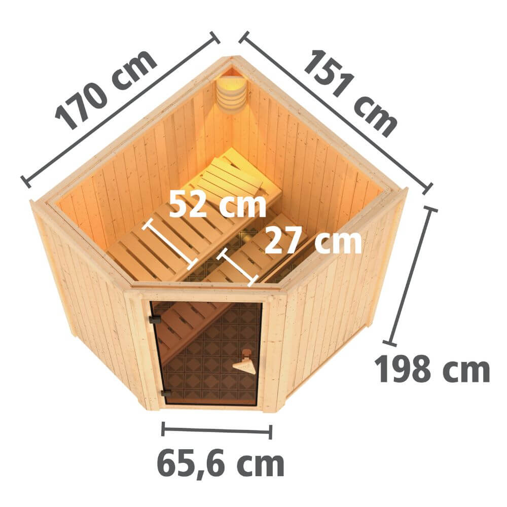 Das volle Saunaerlebnis genießen und dennoch Energie sparen. Dies ist möglich mit unserenr 68mm Systemsauna Tonja und dem steckerfertigen 3,6kW-Saunaofen. Durch die vormontierten Wandelemente kann die Sauna schnell und einfach montiert werden. Die 68mm starken Elemente bestehen aus einer Rahmenkonstruktion, welche an der Sichtseite mit 12,5mm starkem Spezial-Softline-Profilholz verstärkt sind. Diese Konstruktion bietet eine ideale Isolierung und hält die Wärme perfekt im Innenraum. Optional ist die Sauna Tonja mit einem Dachkranz inkl. drei LED-Spots erhältlich. Diese sorgen nicht nur für ein schönes Ambiente im Außenbereich der Sauna, sondern setzen diese auch noch gekonnt in Szene. Die Außenmaße betragen 170 x 151 x 198cm (B/T/H). In den großen Innenraum der Sauna gelangen Sie durch eine Saunatür. Hier haben Sie die Wahl aus vier Varianten und das ganz ohne Mehrkosten. Egal ob in der wärmegedämmten, energiesparenden Version, der klaren Ganzglastür, der Version mit bronzierte Ganzglastür oder der modernen graphitfarbenen Türversion. Hier ist garantiert für jeden Geschmack das Richtige dabei. Um sich im Saunainneren perfekt erholen zu können, wird hier1 Saunaliege aus massivem Espenholz montiert. Das Holz ist besonders weich und nimmt die Wärme nicht so stark an. Dies ermöglicht ein angenehmes Sitz- und Liegegefühl. Bei dem steckerfertigen Saunaofen können Sie zwischen drei Varianten wählen. Einer mit integrierter Steuerung, einer mit externem Steuergerät Easy und einem 3,6kW Bio-Kombi-Ofen. Das Besondere an diesem Saunaofen ist aber nicht seine Variantenvielfallt, sondern der Anschluss. Der Ofen wird mithilfe eines Steckers zur Inbetriebnahme an eine hausübliche 230Volt-Steckdose angeschlossen. Da hierfür kein Fachmann erforderlich ist, entfallen die Kosten für einen Elektriker und einen Umbau auf einen 400 Volt-Anschluss. Genießen Sie das volle Saunaerlebnis und sparen zusätzlich Energie mit der 68mm Plug & Play Sauna Tonja.