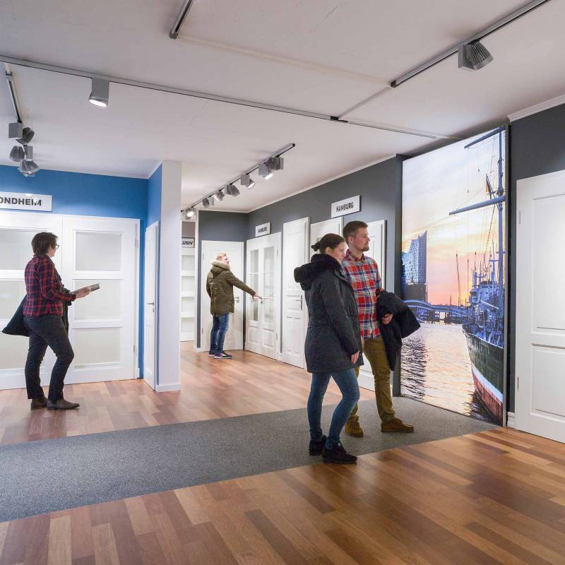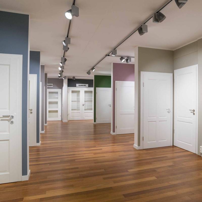 Besuchen Sie uns in Hamburgs größter Parkett- und Türenausstellung. Hier können Sie über 500 Parkett-Tafeln und 150 Mustertüren erleben, anfassen und ausprobieren.
