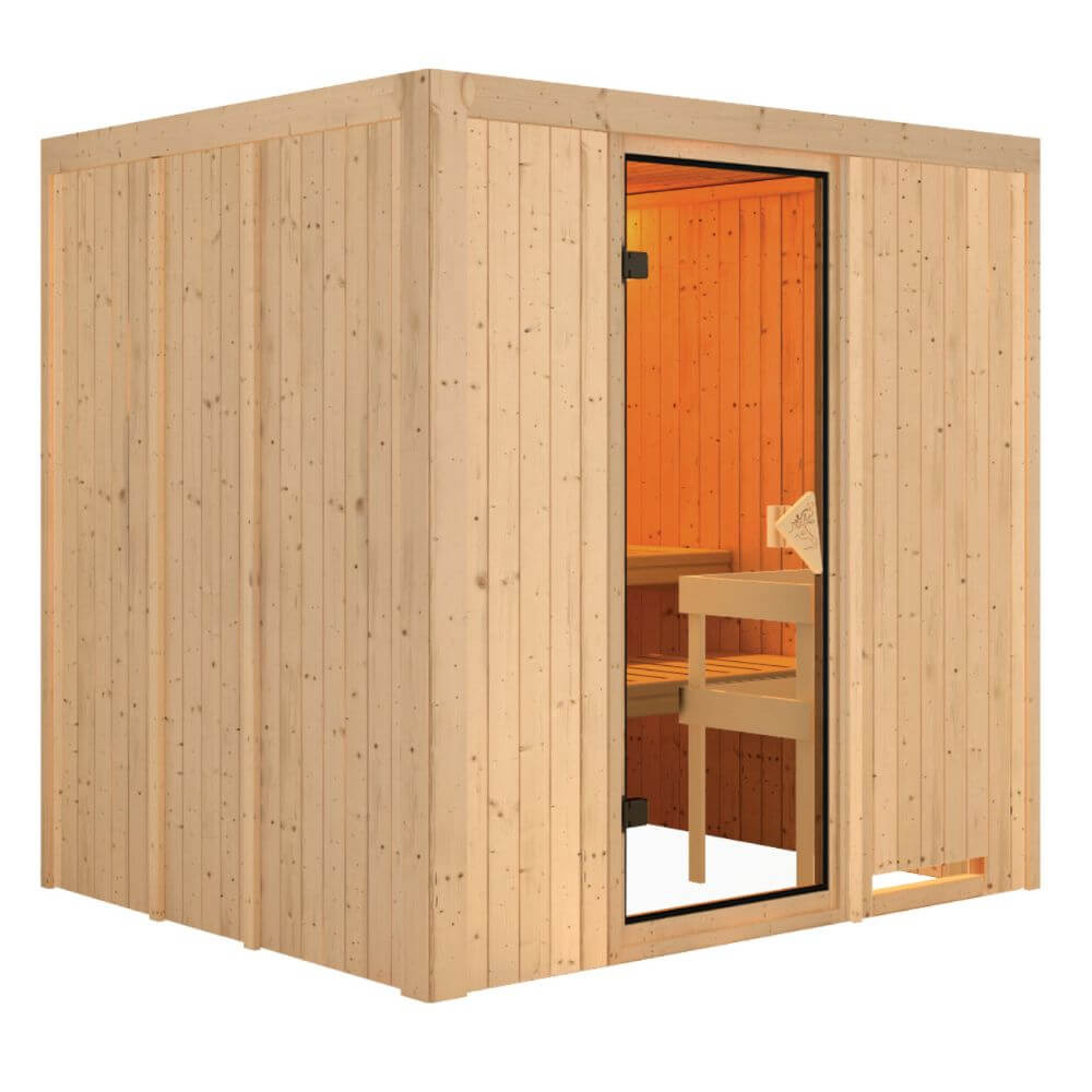 Das volle Saunaerlebnis genießen und dennoch Energie sparen. Dies ist möglich mit unserenr 68mm Systemsauna Daria und dem steckerfertigen 3,6kW-Saunaofen. Durch die vormontierten Wandelemente kann die Sauna schnell und einfach montiert werden. Die 68mm starken Elemente bestehen aus einer Rahmenkonstruktion, welche an der Sichtseite mit 12,5mm starkem Spezial-Softline-Profilholz verstärkt sind. Diese Konstruktion bietet eine ideale Isolierung und hält die Wärme perfekt im Innenraum. Optional ist die Sauna Daria mit einem Dachkranz inkl. drei LED-Spots erhältlich. Diese sorgen nicht nur für ein schönes Ambiente im Außenbereich der Sauna, sondern setzen diese auch noch gekonnt in Szene. Die Außenmaße betragen 196 x 170 x 198cm (B/T/H). In den großen Innenraum der Sauna gelangen Sie durch eine Saunatür. Hier haben Sie die Wahl aus vier Varianten und das ganz ohne Mehrkosten. Egal ob in der wärmegedämmten, energiesparenden Version, der klaren Ganzglastür, der Version mit bronzierte Ganzglastür oder der modernen graphitfarbenen Türversion. Hier ist garantiert für jeden Geschmack das Richtige dabei. Um sich im Saunainneren perfekt erholen zu können, wird hier1 Saunaliege aus massivem Espenholz montiert. Das Holz ist besonders weich und nimmt die Wärme nicht so stark an. Dies ermöglicht ein angenehmes Sitz- und Liegegefühl. Bei dem steckerfertigen Saunaofen können Sie zwischen drei Varianten wählen. Einer mit integrierter Steuerung, einer mit externem Steuergerät „Easy“ und einem 3,6kW Bio-Kombi-Ofen. Das Besondere an diesem Saunaofen ist aber nicht seine Variantenvielfallt, sondern der Anschluss. Der Ofen wird mithilfe eines Steckers zur Inbetriebnahme an eine hausübliche 230Volt-Steckdose angeschlossen. Da hierfür kein Fachmann erforderlich ist, entfallen die Kosten für einen Elektriker und einen Umbau auf einen 400 Volt-Anschluss. Genießen Sie das volle Saunaerlebnis und sparen zusätzlich Energie mit der 68mm Plug & Play Sauna Daria.