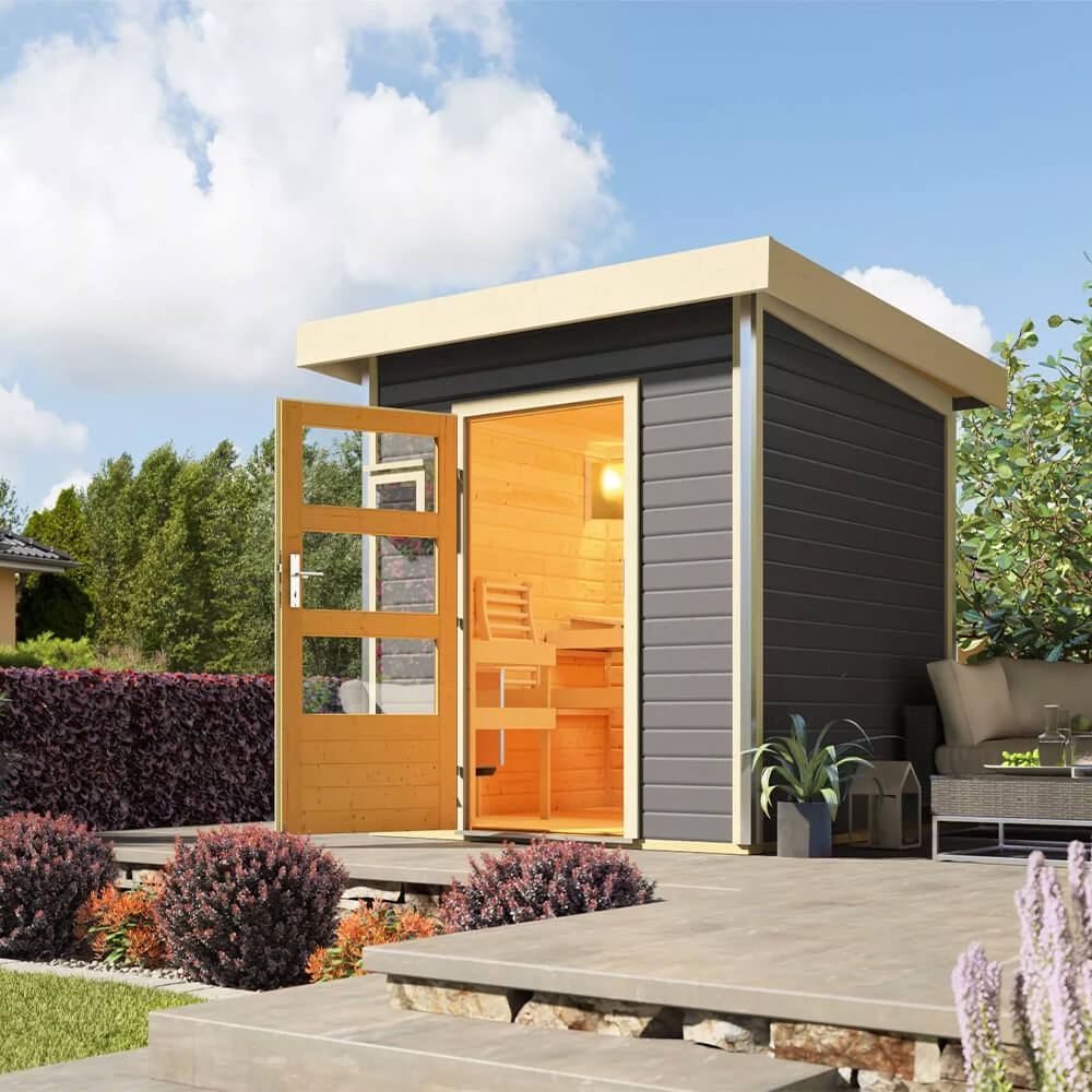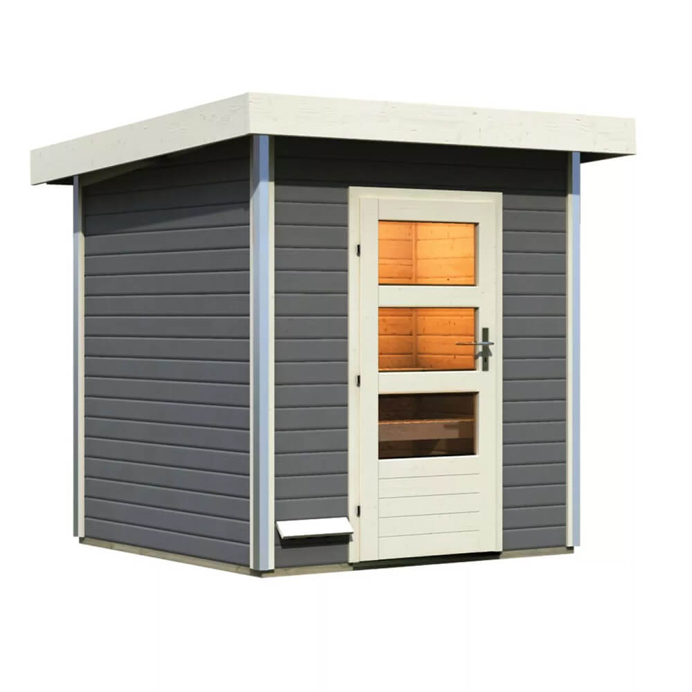 Das Saunahaus besteht aus 38mm Massivholzbohlen aus nordischem Fichtenholz und wird im einfachen Steck- und Schraubsystem montiert. Es ist in der modernen Farbe terragrau oder in dem klassischen naturbelassenen Holz erhältlich. Zum Schutz des Steuergerätes vor Nässe ist ein Steuergerät-Schutzkasten im Lieferumfang enthalten. Das schützende Pultdachhaus besteht aus Massivholz und bietet, ausgestattet mit einer optional erhältlichen selbstklebenden Dachfolie, den idealen Schutz vor der Witterung.