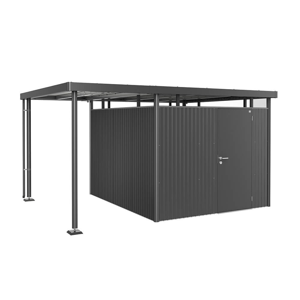 Das Seitendach wird am Gerätehaus HighLine® (ab Gr. H2) jeweils an der Seite mit der Regenrinne – wahlweise ein- oder beidseitig – fixiert. Die Alu-Stützen sind mit höhenverstellbaren Füßen ausgestattet. Regenfallrohr inkl. Die Dachfläche des Seitendaches ist immer quarzgrau-metallic!