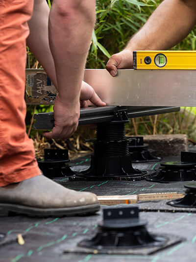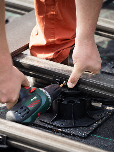Jetzt folgt der wichtigste Schritt, bevor die Dielen verlegt werden: 2 % Gefälle herstellen. Das geht mit den Terrassen-Stelzlagern sehr einfach, denn die sind stufenlos tarier- und höhenverstellbar. Perfekt fürs Nivellieren!