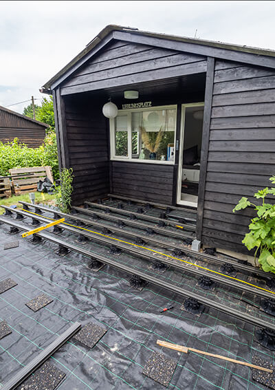 Existiert ein tragfähiger Untergrund z. B. eine betonierte Bodenplatte oder eine alte Steinterrasse kann direkt mit dem Aufbau der Unterkonstruktion für die Terrasse gestartet werden.