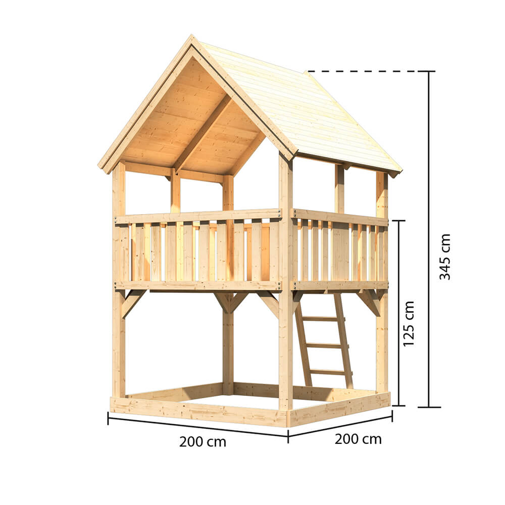 Unser Spielturm Luis steht wortwörtlich über den Dingen. Mit den 90 x 90 mm starken Pfosten und einer Firsthöhe von 345 cm ist er über jeden Zweifel erhaben. Die Rohware für unseren Luis kommt wie bei allen anderen Spieltürmen auch aus dem hohen Norden Europas. Durch die dort vorherrschenden harten Winter wächst das Holz langsamer, die Jahresringe stehen enger zusammen und das Holz wird härter. Dadurch, dass wir unsere Spieltürme naturbelassen an Sie ausliefern, können wir sicher sein, dass sich keinerlei bekannte problematische Substanzen im Holz befinden.
