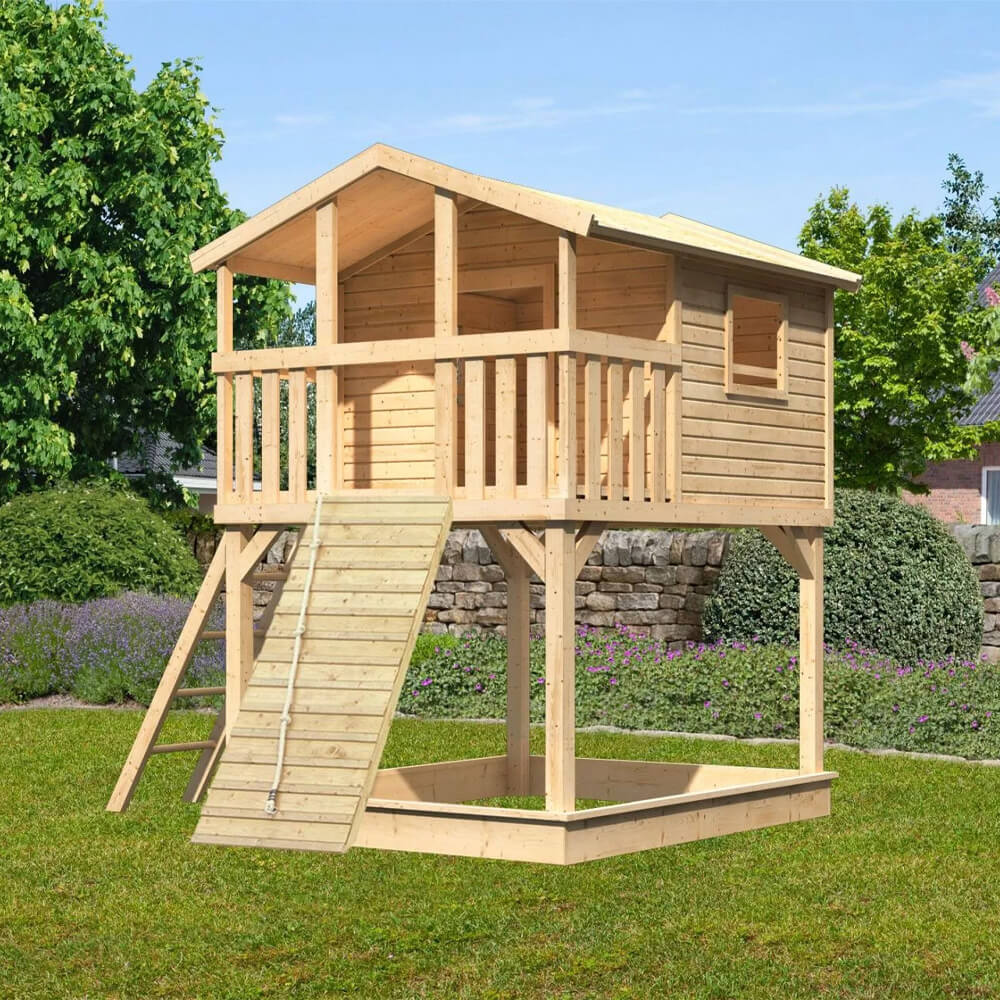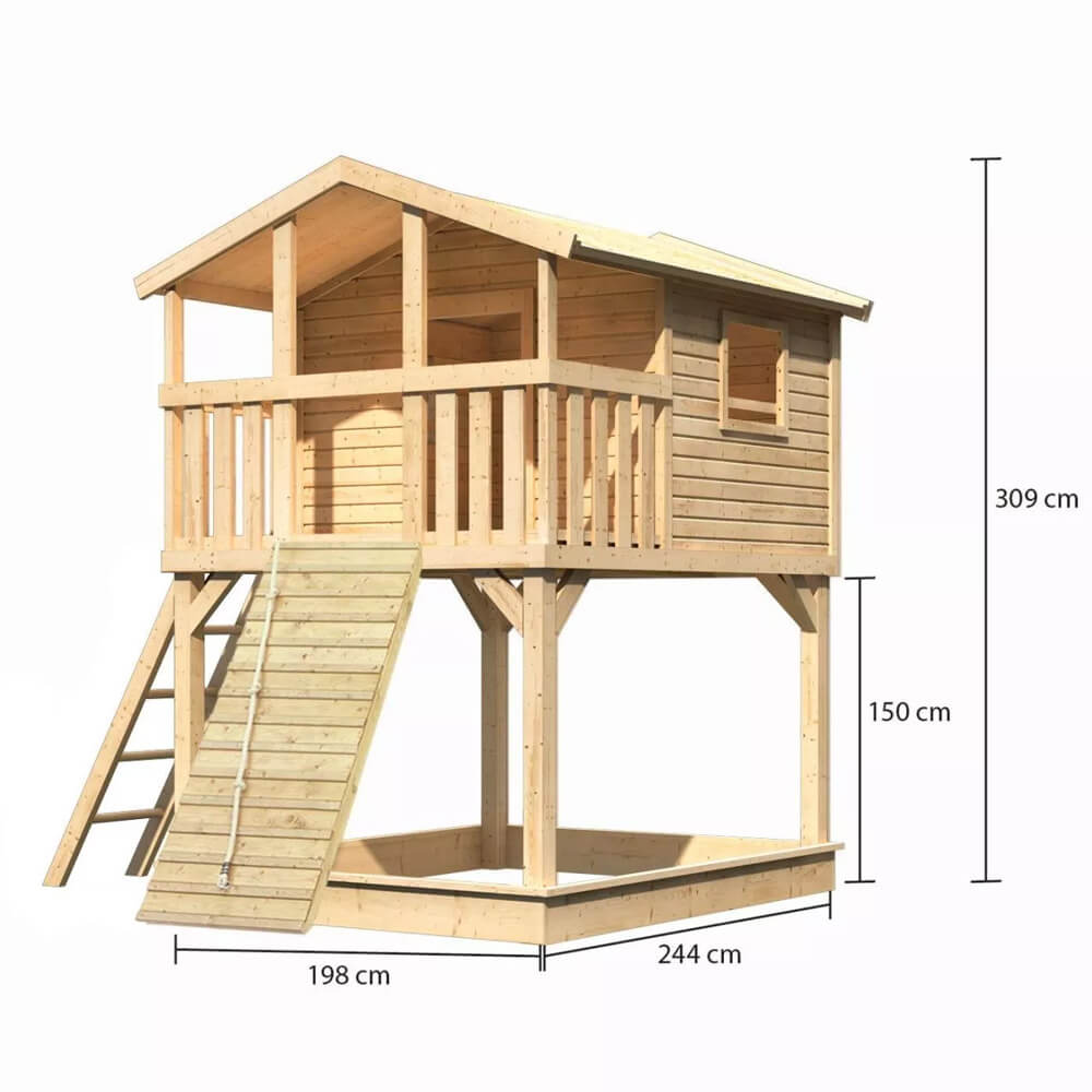 Dieses Stelzenhaus aus 19 mm starken Wandbrettern mit einer Podesthöhe von 150 cm beflügelt die Fantasie Ihrer Kinder. 4 Massivholzpfosten mit einer Stärke von 90 mm x 90 mm und Terrassen vor dem Haus mit Brüstung sorgen für viel Sicherheit für Ihre Kleinen. Im Lieferumfang ist eine Holzleiter enthalten, die den Zugang zur Terrasse vereinfacht. Das Außenmaß dieses Hauses beträgt 198 cm x 244 cm x 309 cm und bietet somit unglaublich viel Platz um die Fantasie anzukurbeln. Das Haus wird mit einem Satteldach aus Massivholz geschützt. Die 6 m² große Dachfläche bietet auch der Terrasse noch Schutz und sorgt für unbeschwertes Spielvergnügen, egal zu welcher Jahreszeit. Unsere Stelzenhäuser bieten mit einer Rutsche in vielen Farben sowie weiterem umfangreichem Zubehör alles, was das Kinderherz begehrt.