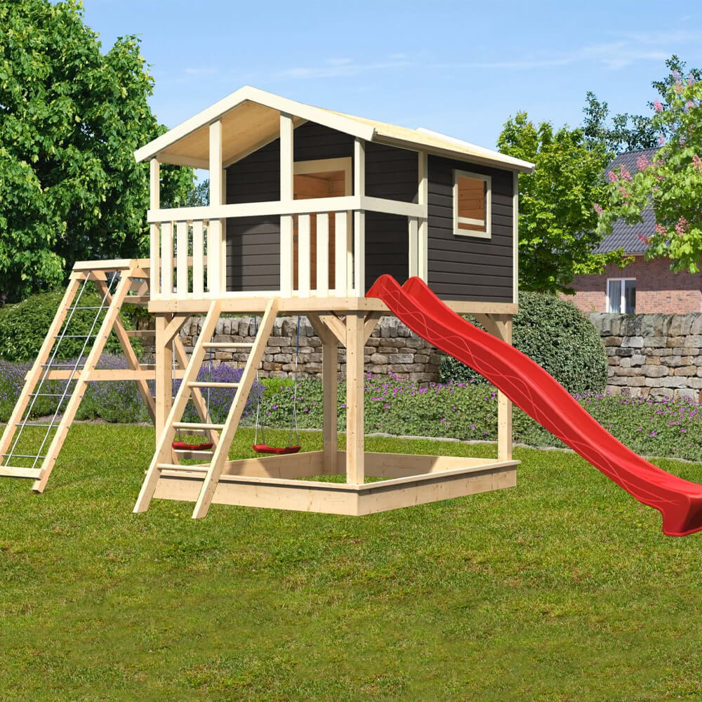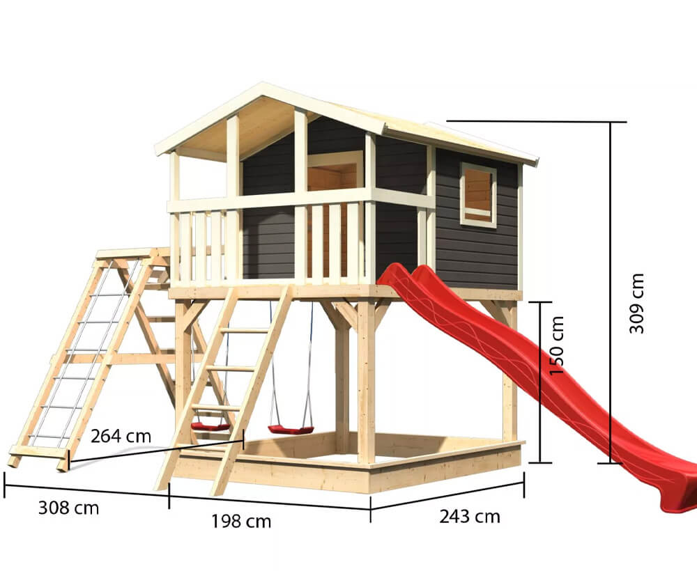 Dieses Stelzenhaus aus 19 mm starken Wandbrettern mit einer Podesthöhe von 150 cm beflügelt die Fantasie Ihrer Kinder. 4 Massivholzpfosten mit einer Stärke von 90 mm x 90 mm und Terrassen vor dem Haus mit Brüstung sorgen für viel Sicherheit für Ihre Kleinen. Im Lieferumfang ist eine Holzleiter enthalten, die den Zugang zur Terrasse vereinfacht. Das Außenmaß dieses Hauses beträgt 198 cm x 244 cm x 309 cm und bietet somit unglaublich viel Platz um die Fantasie anzukurbeln. Das Haus wird mit einem Satteldach aus Massivholz geschützt. Die 6 m² große Dachfläche bietet auch der Terrasse noch Schutz und sorgt für unbeschwertes Spielvergnügen, egal zu welcher Jahreszeit. Unsere Stelzenhäuser bieten mit einer Rutsche in vielen Farben sowie weiterem umfangreichem Zubehör alles, was das Kinderherz begehrt.