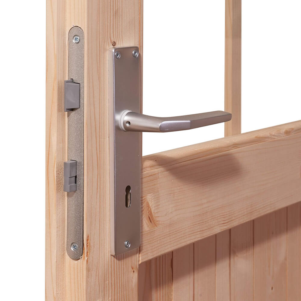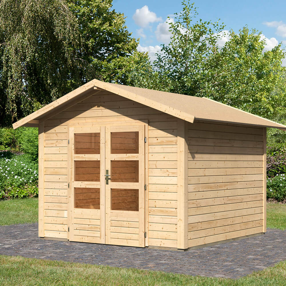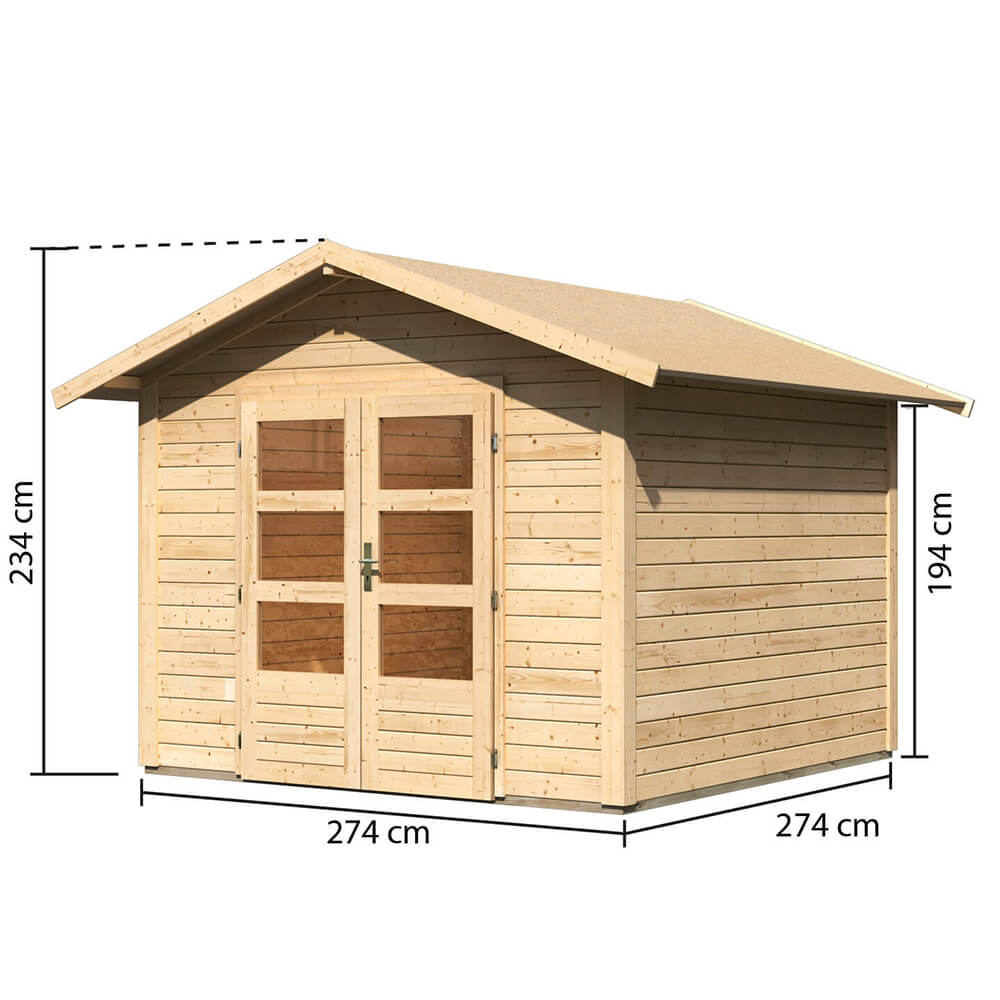 28 mm Wandstärke, Doppeltür, Steck- Schraubsystem, Firsthöhe 230 cm, Nadelholz naturbelassen.