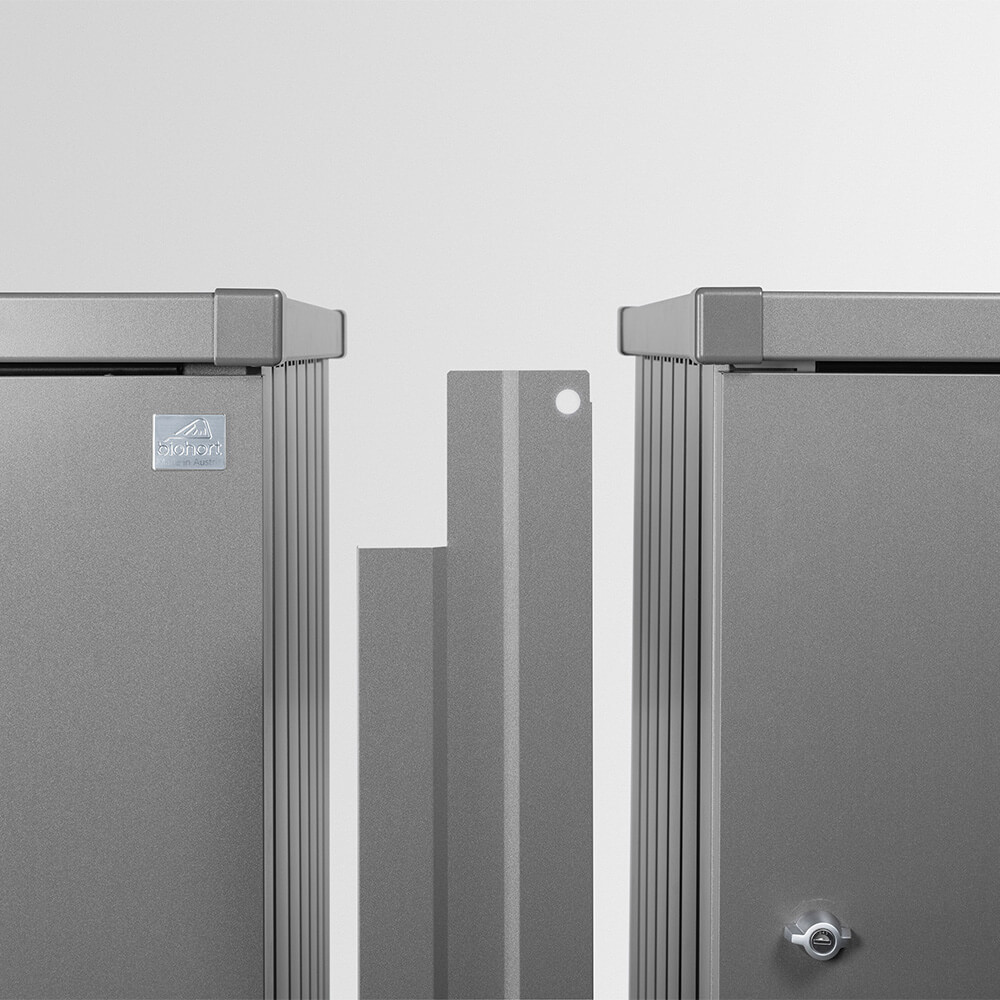 Die Verbindungsbleche decken den Spalt zwischen zwei Mülltonnenboxen an der Vorder- und Rückseite ab.